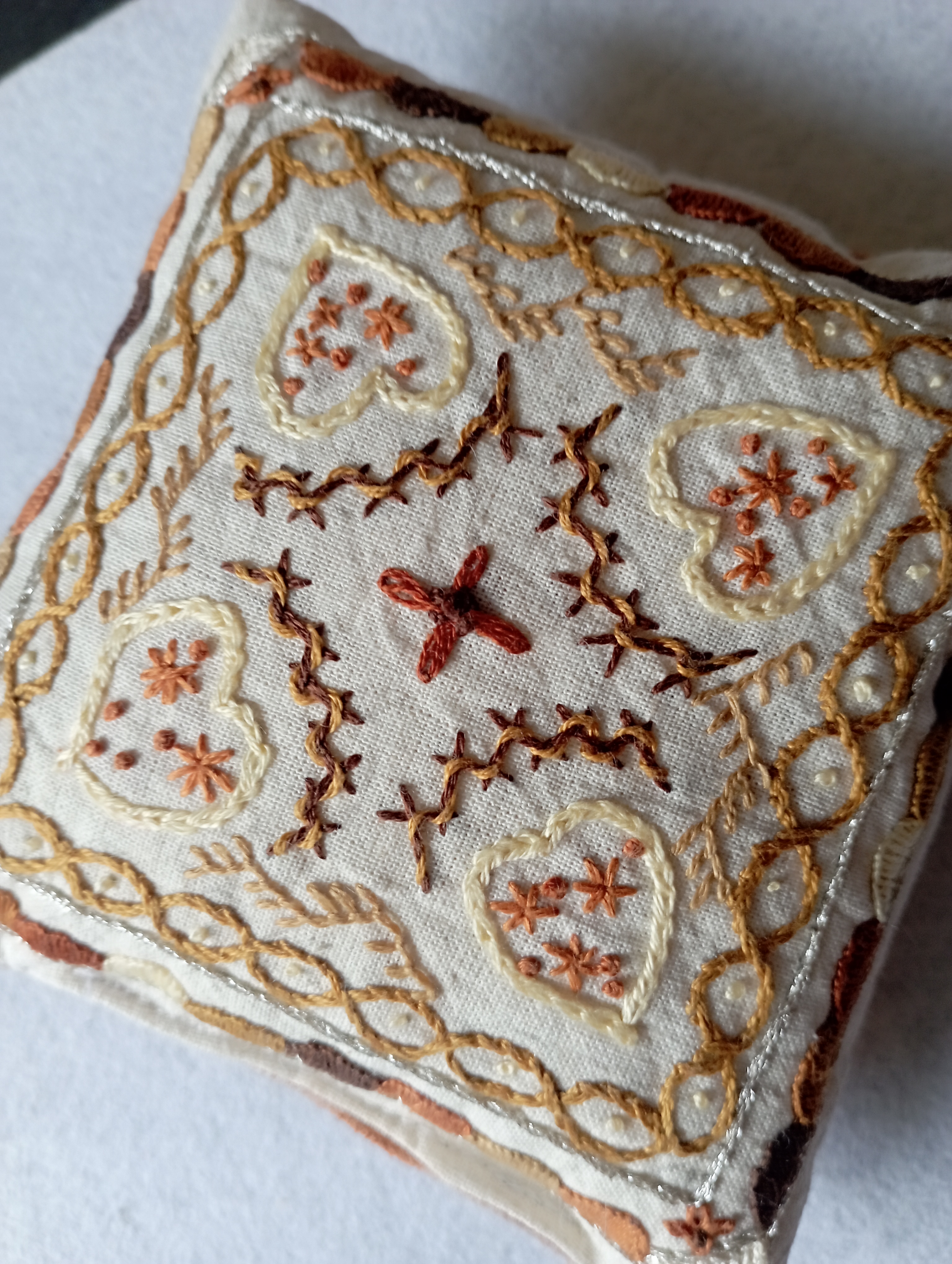 Après le coussin à épingles du mois précédent, mon penchant pour la broderie me tenaillait toujours, avec le double effet Kiss cool de donner un peu de repos supplémentaire à ma vieille ennemie l’épicondylite. 😁 Je n’ai même pas cherché à résister à l’envie d’en broder un second !
