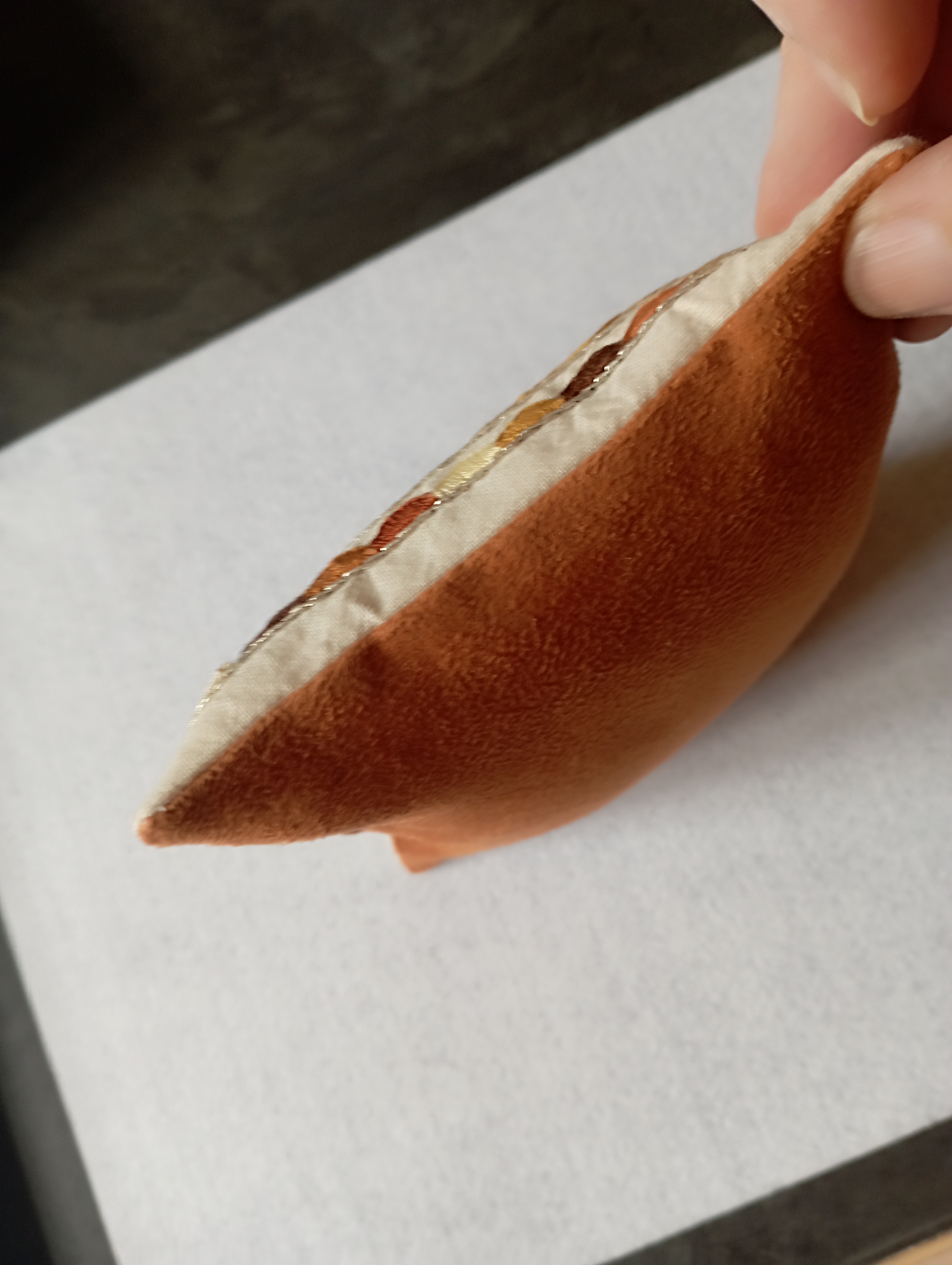 Toujours dans l’optique d’évoquer un esprit automnal, j’ai utilisé pour le dos un reste de suédine couleur écureuil. C’est un bon choix car la suédine donne un peu d’adhérence au coussin, ce qui donne plus de stabilité et facilite la pose ou la prise d’épingles. Et en plus son petit côté velouté a de quoi charmer notre côté tactile.